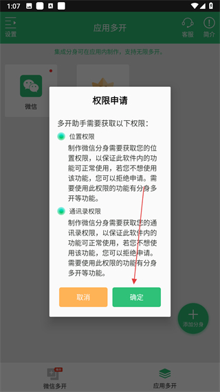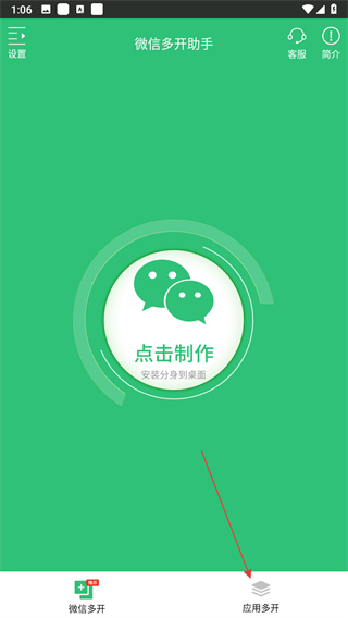 1、打開(kāi)微信多開(kāi)助手應(yīng)用,點(diǎn)擊底部導(dǎo)航欄中的應(yīng)用多開(kāi)選項(xiàng)。