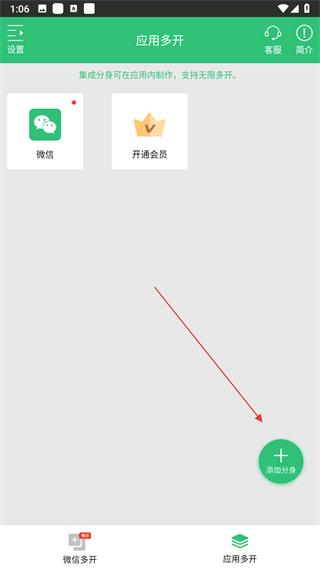 2、在應(yīng)用多開(kāi)界面,點(diǎn)擊右下角的添加分身綠色按鈕。