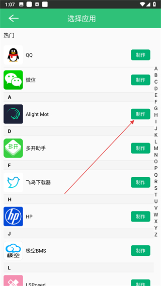 4、進(jìn)入選擇應(yīng)用界面,找到想要制作分身的應(yīng)用,點(diǎn)擊其右側(cè)的制作按鈕即可。