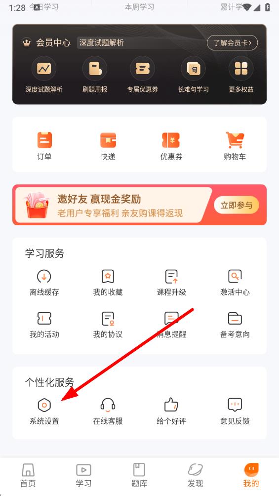 2、在我的界面中,向下滑動找到個性化服務(wù)板塊,點擊系統(tǒng)設(shè)置。