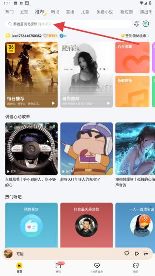 1、打開酷我音樂APP,點(diǎn)擊頁面頂部的搜索欄。
