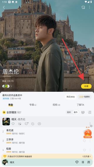 4、進(jìn)入歌手主頁后,點(diǎn)擊收藏的按鈕,即可成功關(guān)注。