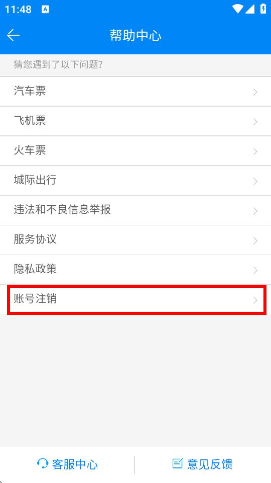 3、在幫助中心頁面中,點擊賬號注銷選項。