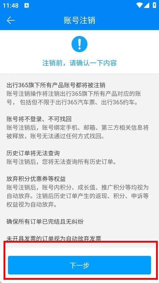 4、仔細閱讀賬號注銷提示內(nèi)容,確認后點擊下一步。