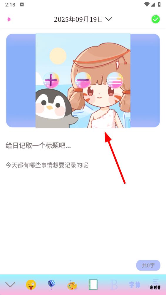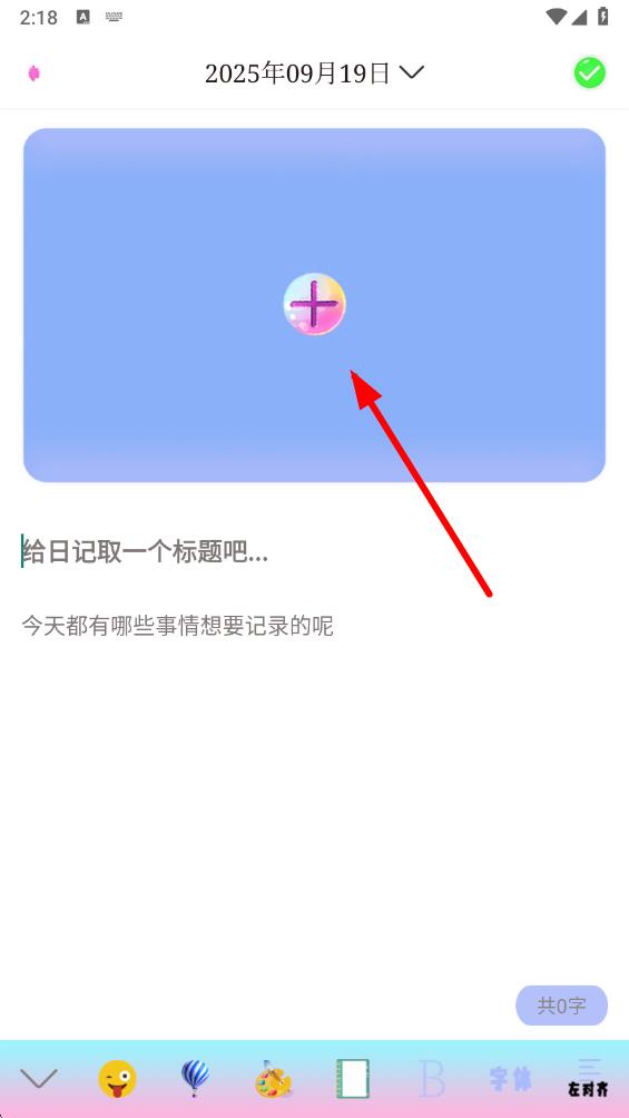 2、在日記編輯頁面中,點擊加號的圓形圖標,調出添加內(nèi)容選項。