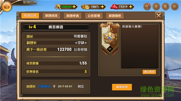 3、旅團申請:可設(shè)置自由加入ON、和修改招募板。