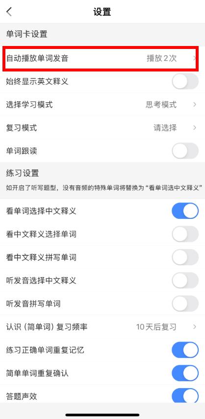 3、進入設置頁面后,找到自動播放單詞發(fā)音選項,按需選擇播放次數(shù)等設置,完成自動播放功能設置。