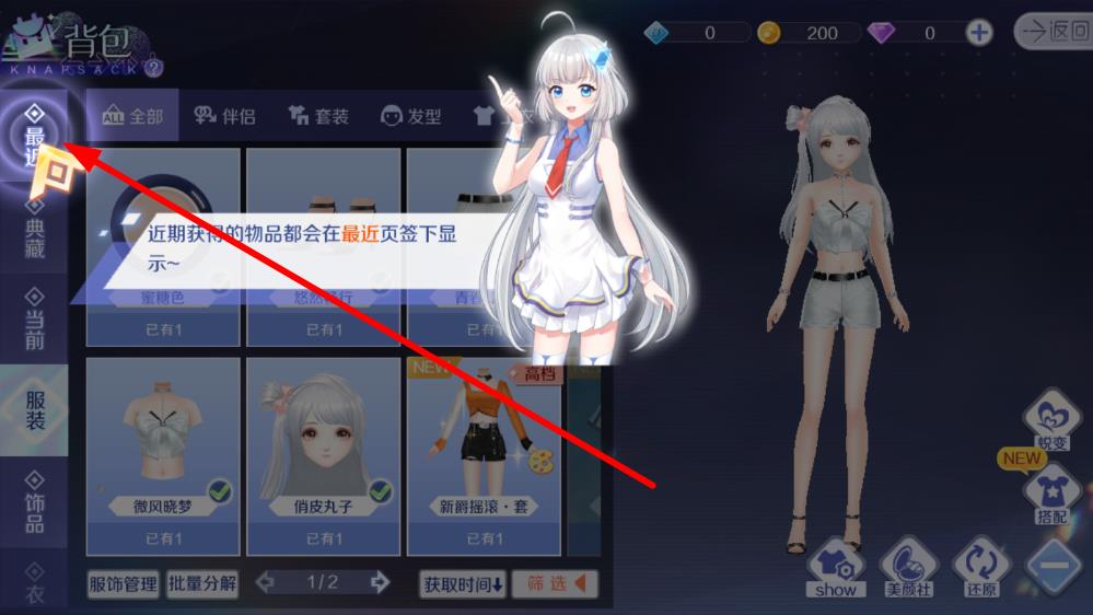 3、在背包界面中,點(diǎn)擊左側(cè)最近或其他分類標(biāo)簽查找想更換的服飾。