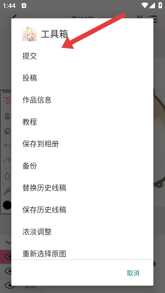 4、進(jìn)入菜單可調(diào)出工具箱,利用提交等功能,對勾線作品進(jìn)行后續(xù)操作。