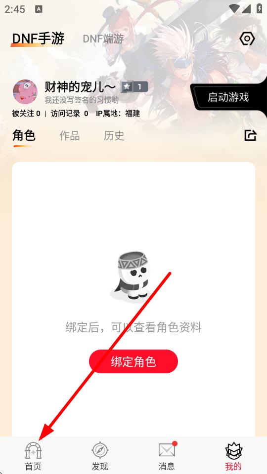 1、打開DNF助手APP,點擊底部導(dǎo)航欄中的首頁選項進(jìn)入首頁界面。