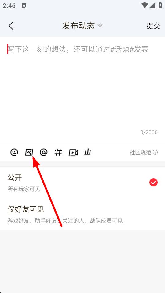 3、進(jìn)入發(fā)布動態(tài)編輯頁面,在編輯框中寫下此刻的想法,還能通過#話題#來豐富內(nèi)容。