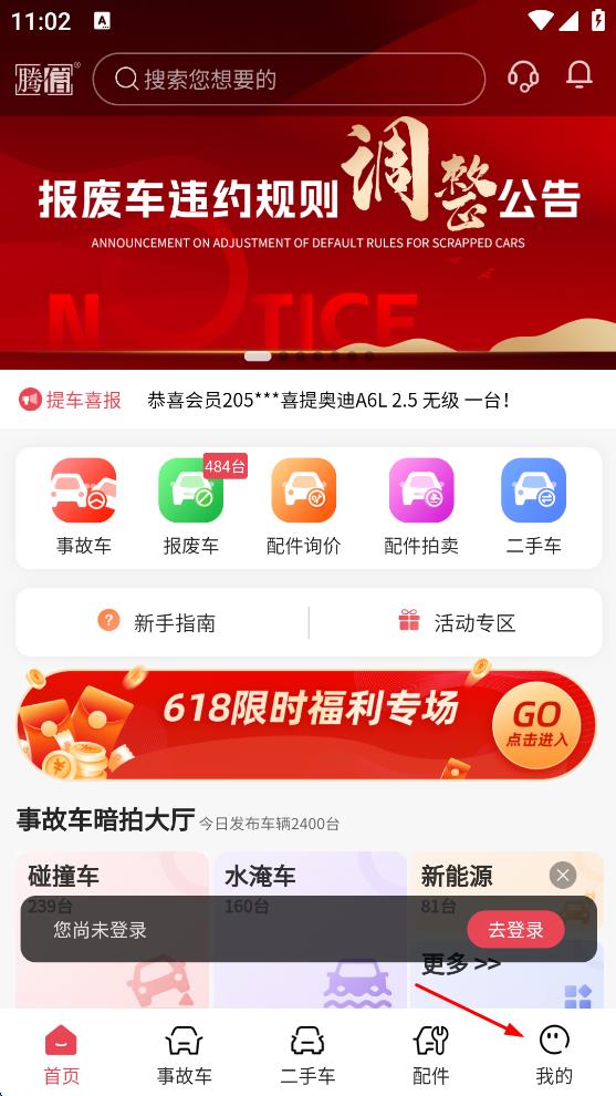 1、打開騰信汽車網(wǎng)軟件,進入首頁后,點擊右下角“我的”按鈕,進入個人中心頁面。