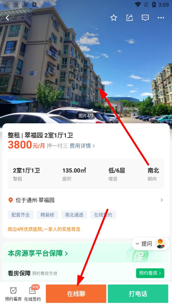 3、進(jìn)入房源詳情頁(yè),可查看房屋外觀、戶型等信息,若想進(jìn)一步溝通,點(diǎn)擊在線聊按鈕聯(lián)系房東。