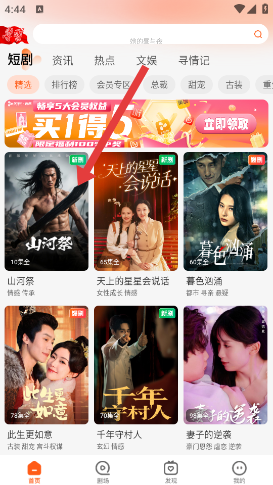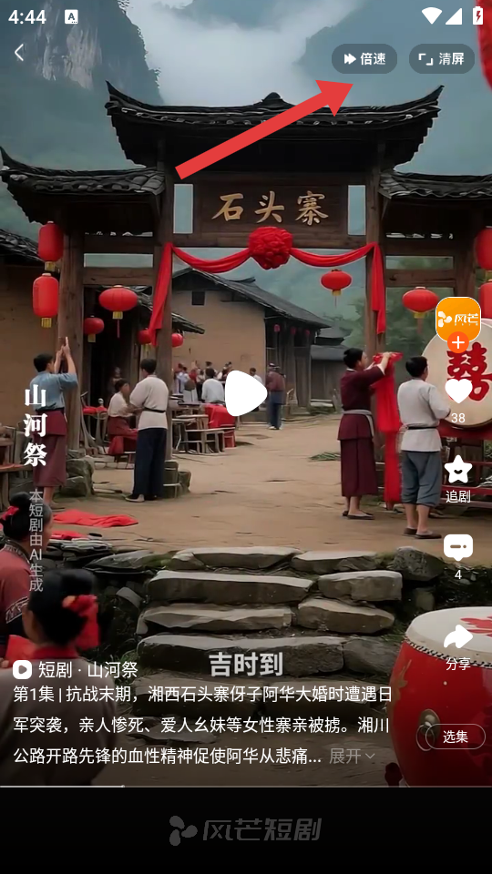 1、打開風(fēng)芒APP,在首頁短劇分類下,點擊想要倍速播放的短劇,進(jìn)入短劇播放頁面。