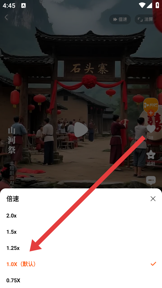 4、在倍速選擇菜單中,點擊想要設(shè)置的播放倍速如1.0x、1.25x等,即可完成倍速播放設(shè)置。