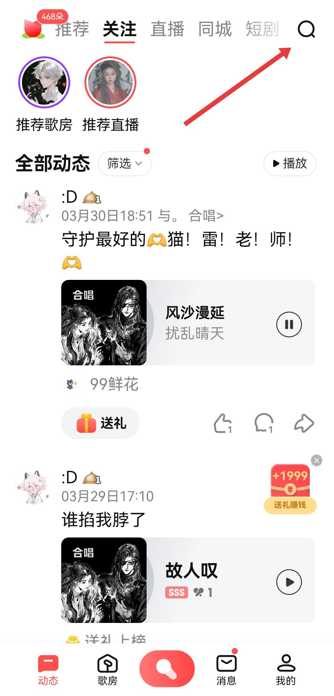 1、進(jìn)入全民K歌動(dòng)態(tài)的頁(yè)面,需要點(diǎn)擊右上角的搜索圖標(biāo),進(jìn)入搜索的界面。
