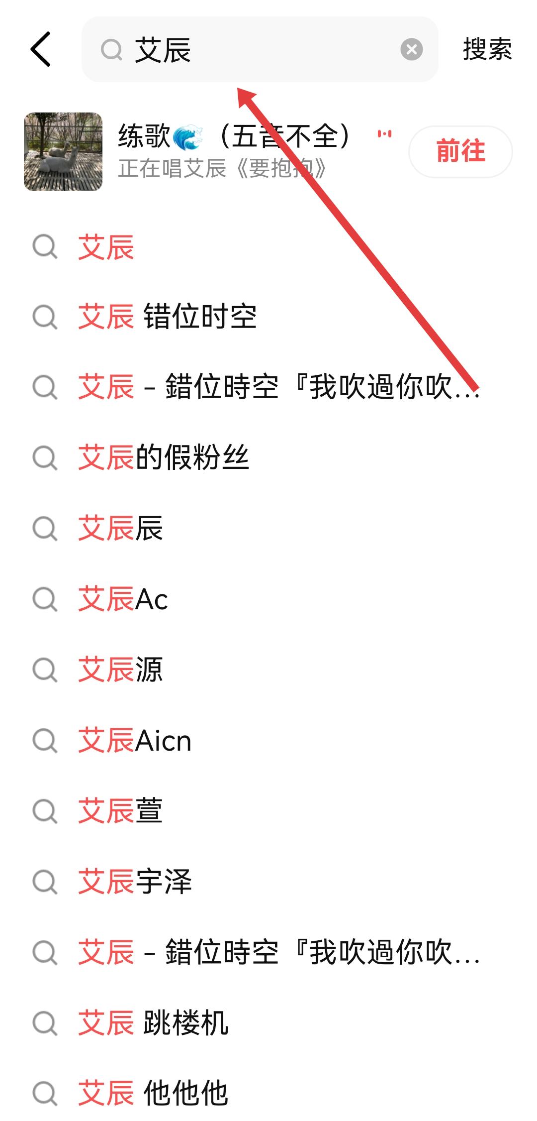 2、在k歌的搜索欄中輸入自己需要關(guān)注的K歌號(hào)名稱如艾辰,查看搜索的結(jié)果。