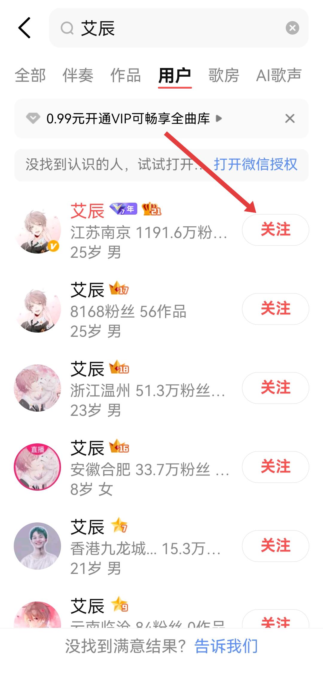 3、在搜索結(jié)果的用戶列表中,找到目標(biāo)K歌號(hào),點(diǎn)擊其右側(cè)的關(guān)注按鈕,即可關(guān)注該K歌號(hào)。