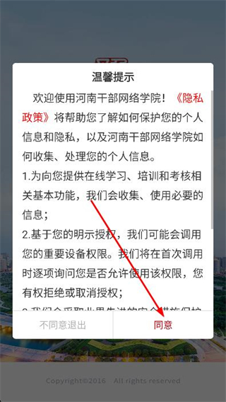 1、打開河南干部網(wǎng)絡(luò)學院,在彈出的窗口中點擊同意。