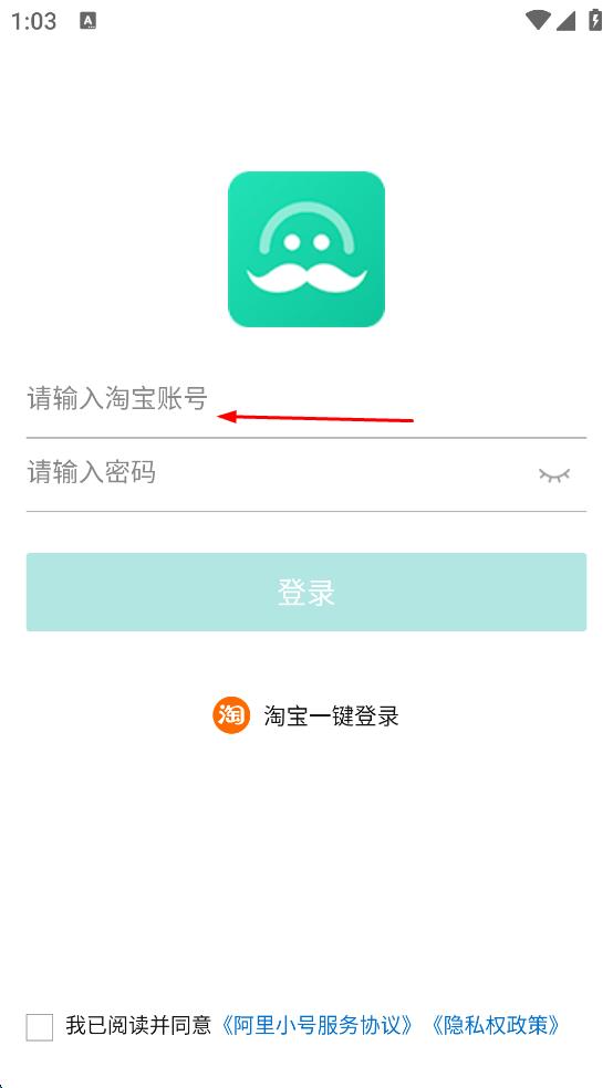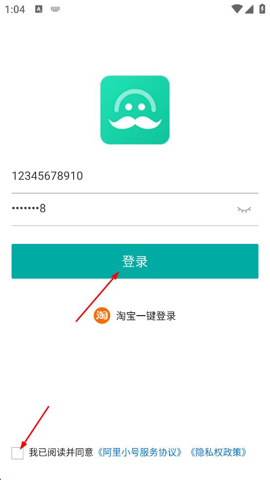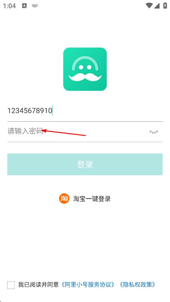 4、填寫好賬號和密碼后,勾選“我已閱讀并同意阿里小號服務(wù)協(xié)議,隱私權(quán)政策選項,然后點擊“登錄”按鈕,即可嘗試登錄阿里小號app。