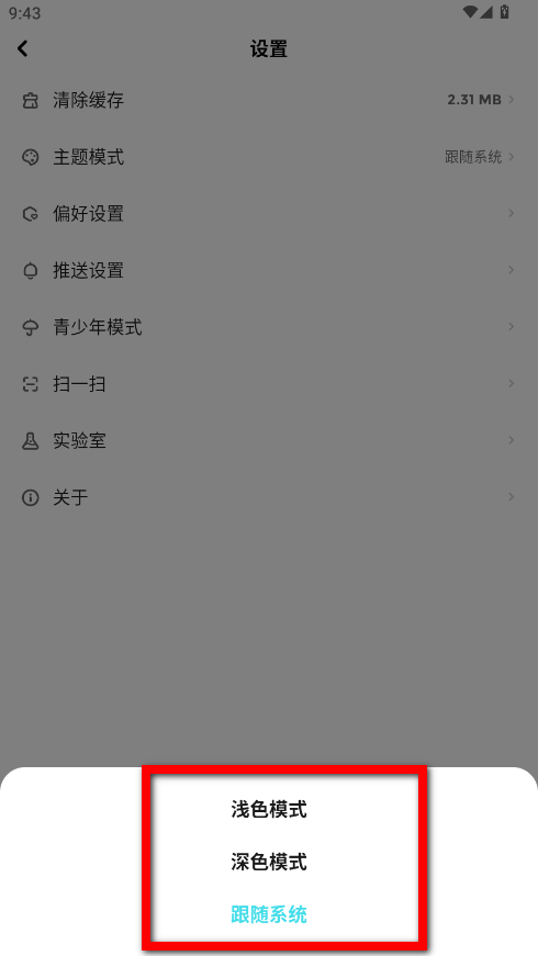 4、在彈出的主題模式選擇框中,選擇淺色模式、深色模式或跟隨系統(tǒng)即可完成設(shè)置。