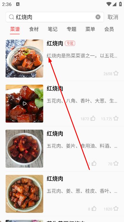 3、在搜索結(jié)果中,點(diǎn)擊需要收藏的菜譜。