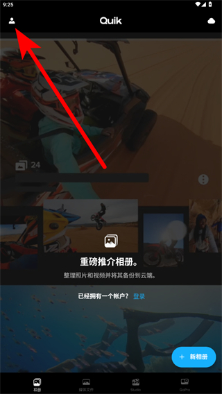 1、打開GoPro Quik應(yīng)用,點(diǎn)擊左上角的個(gè)人圖標(biāo)進(jìn)入個(gè)人資料界面。