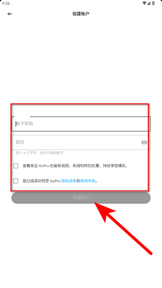 4、填寫電子郵箱和密碼,勾選相關(guān)協(xié)議后,點(diǎn)擊創(chuàng)建賬戶按鈕,完成GoPro Quik賬戶注冊(cè)。
