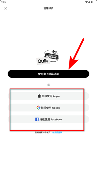 3、在創(chuàng)建賬戶界面,可選擇使用電子郵箱注冊(cè)或通過Apple、Google、Facebook賬號(hào)注冊(cè),這里選擇電子郵箱注冊(cè)。