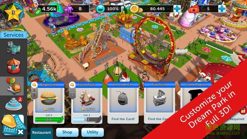 過(guò)山車大亨觸摸版是一款3d模擬經(jīng)營(yíng)類的手機(jī)游戲,在這里創(chuàng)建定制一個(gè)夢(mèng)幻的游樂(lè)園,建設(shè)豐富的中的游樂(lè)設(shè)施,道路,餐館,商店,并裝飾這里,吸引更多的游客前來(lái)玩耍,并獲得利潤(rùn),來(lái)不斷地升級(jí)你的游樂(lè)園,開發(fā)更多的園區(qū),成為游樂(lè)園大亨。
