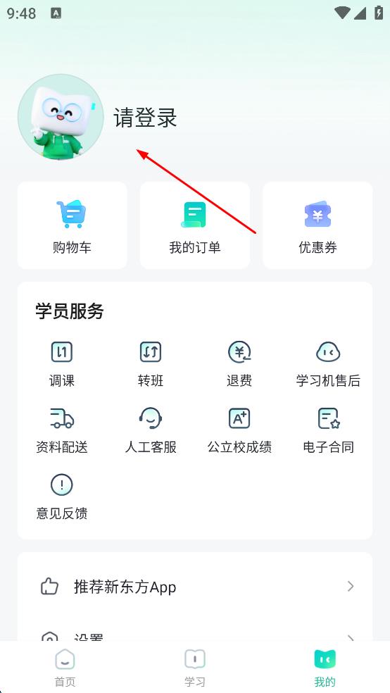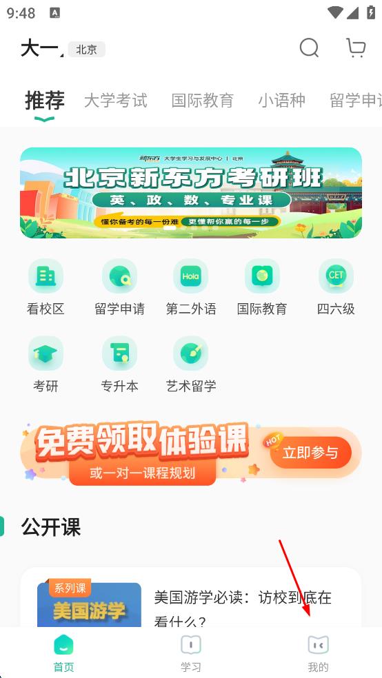 1、打開新東方APP,進(jìn)入首頁(yè)后,點(diǎn)擊右下角“我的”圖標(biāo),進(jìn)入個(gè)人頁(yè)面。