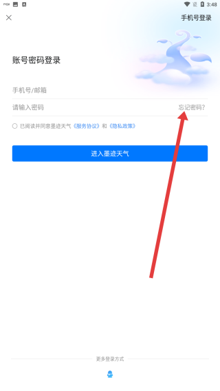 1、在墨跡天氣賬號登錄界面中,若忘記密碼,可以點擊忘記密碼按鈕進行找回。