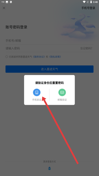 2、在點擊忘記密碼按鈕后,選擇彈窗中的手機驗證選項進行找回。