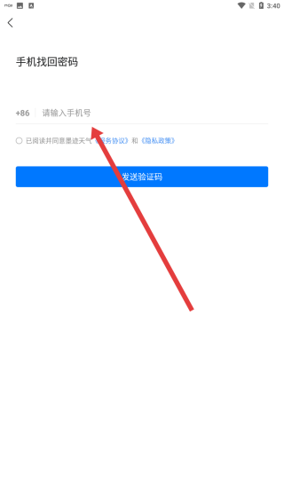 3、在手機找回密碼頁面中,需輸入手機號以便發(fā)送驗證碼找回密碼。