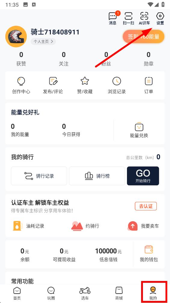 1、打開摩托范app點擊底部導航欄最右側我的選項,然后點擊頁面右上角設置圖標。