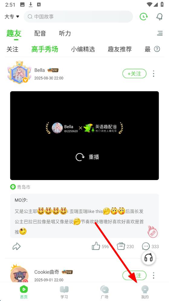 1、打開英語趣配音APP在底部導(dǎo)航欄找到我的圖標(biāo)點(diǎn)擊進(jìn)入。