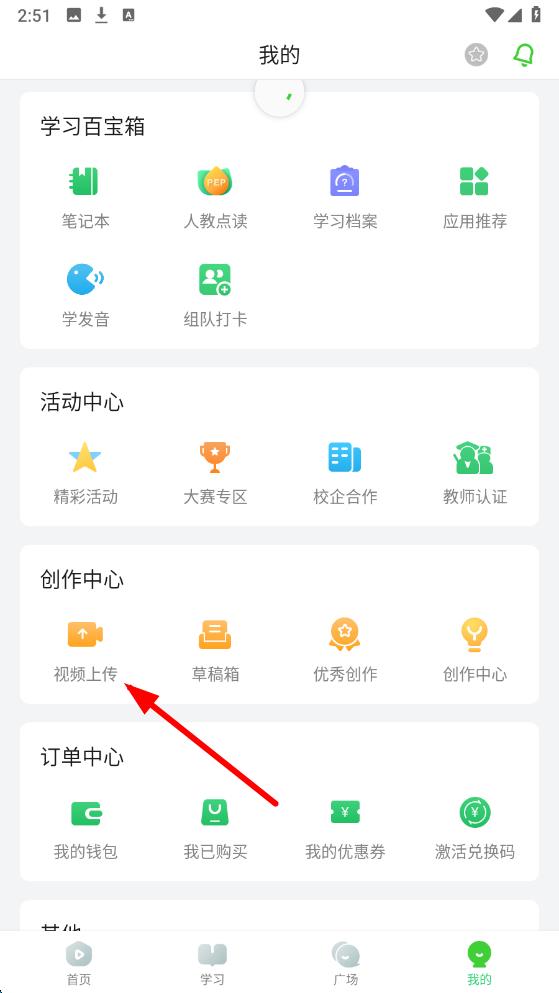 2、進(jìn)入我的頁面后下滑找到創(chuàng)作中心板塊,點(diǎn)擊其中的視頻上傳選項(xiàng)。
