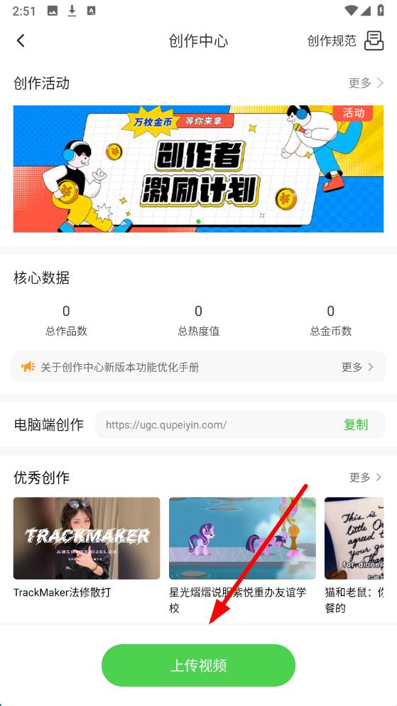 3、進(jìn)入創(chuàng)作中心頁面后,點(diǎn)擊下方綠色的上傳視頻按鈕,按照提示完成視頻上傳操作即可。
