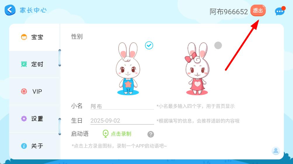 3、在家長(zhǎng)中心頁(yè)面,點(diǎn)擊右上角的退出按鈕,即可完成退出操作。