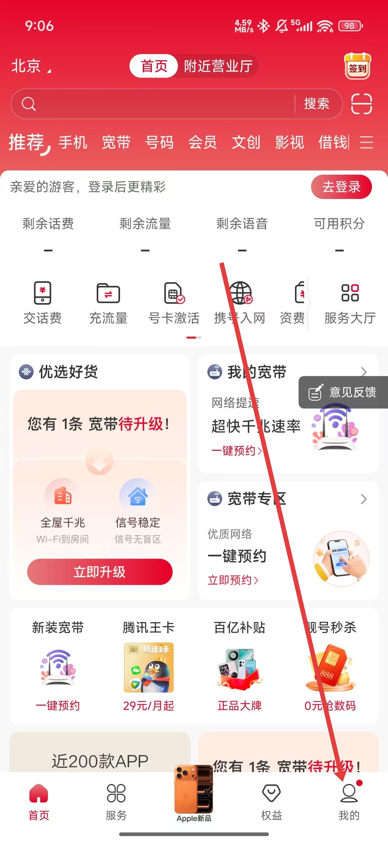 1、可以通過點擊中國聯(lián)通首頁下我的按鈕,進入我的主頁中。