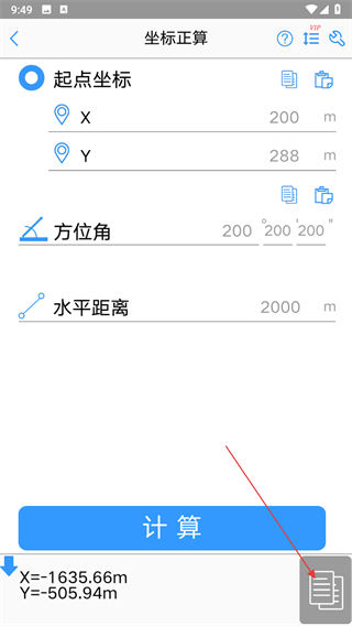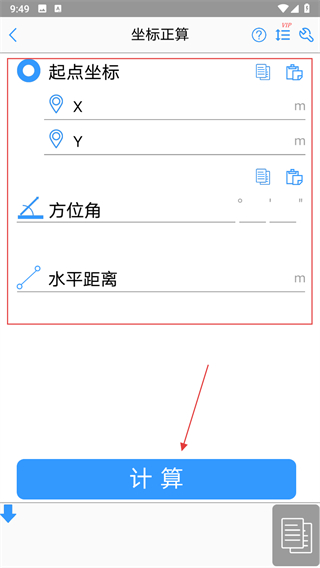 3、在坐標正算頁面,依次輸入起點坐標、方位角以及水平距離,輸入完成后點擊計算按鈕。