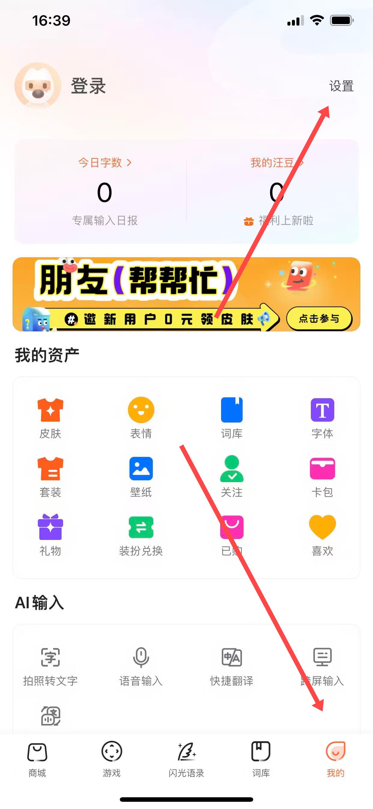 1、打開(kāi)搜狗輸入法APP,進(jìn)入主界面我的選項(xiàng),找到并點(diǎn)擊右上角的設(shè)置按鈕。