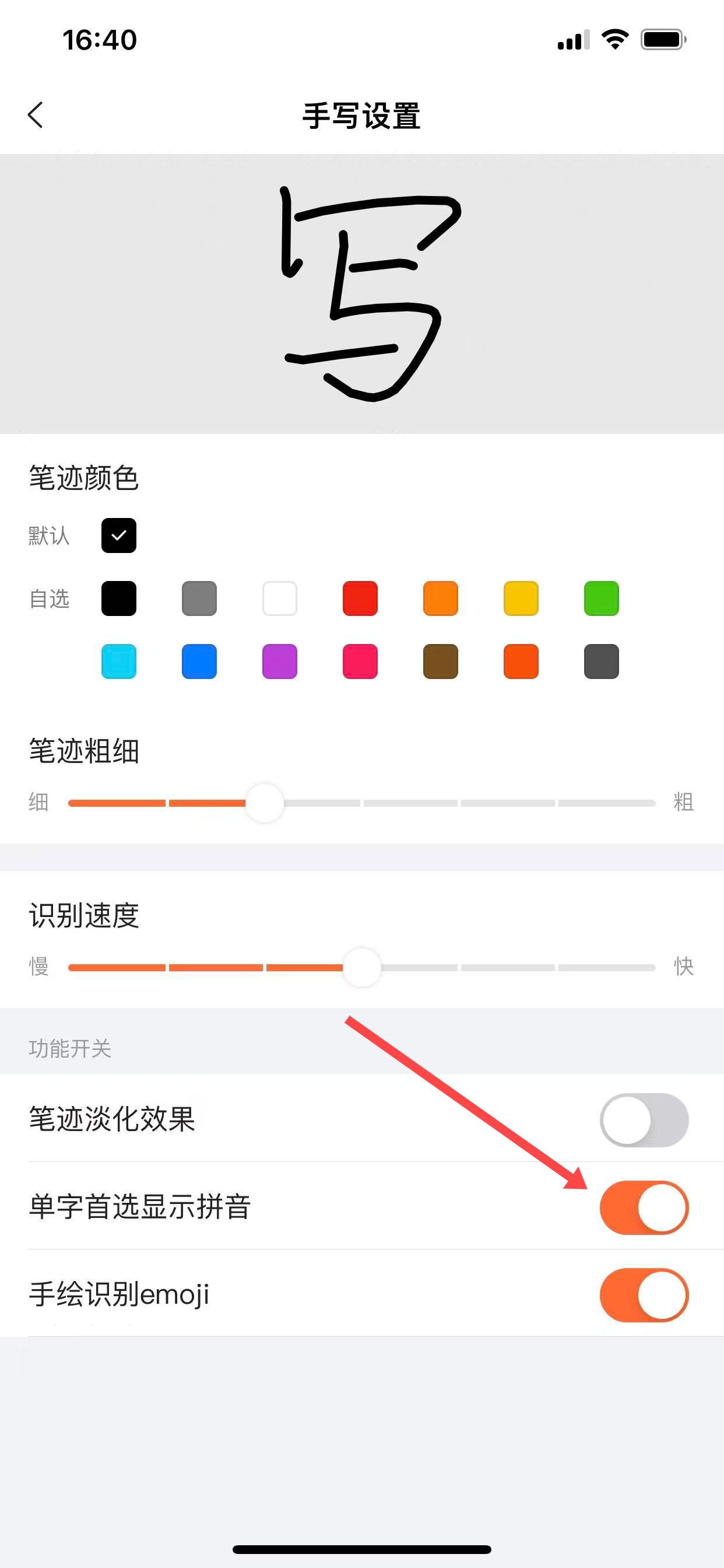 3、在手寫(xiě)設(shè)置界面中,找到單字首選顯示拼音的開(kāi)關(guān),點(diǎn)擊將其開(kāi)啟。