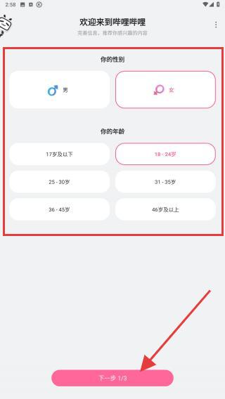1、在歡迎來到嗶哩嗶哩頁(yè)面,選擇性別和年齡,點(diǎn)擊底部粉色下一步的按鈕。