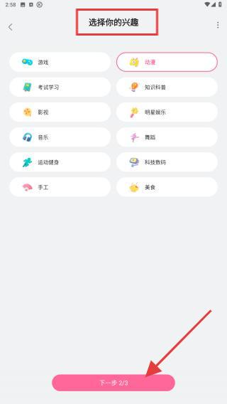 2、在選擇你的興趣頁(yè)面,點(diǎn)擊感興趣的標(biāo)簽如動(dòng)漫、游戲等,選好后點(diǎn)擊底部下一步2/3按鈕。