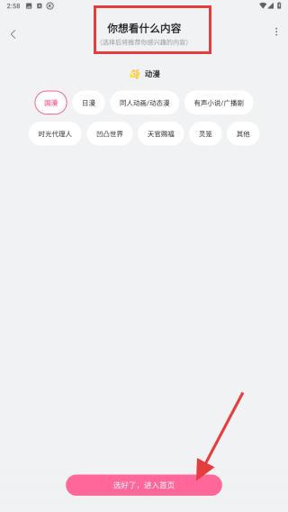 3、在你想看什么內(nèi)容頁(yè)面,選擇具體內(nèi)容類型,確認(rèn)后點(diǎn)擊底部選好了,進(jìn)入首頁(yè)按鈕,即可進(jìn)入嗶哩嗶哩首頁(yè)。