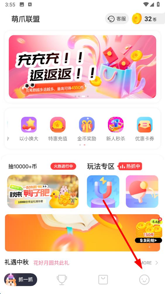 1、打開(kāi)萌爪聯(lián)盟app,進(jìn)入首頁(yè),點(diǎn)擊底部導(dǎo)航欄最右側(cè)個(gè)人圖標(biāo),進(jìn)入個(gè)人界面。