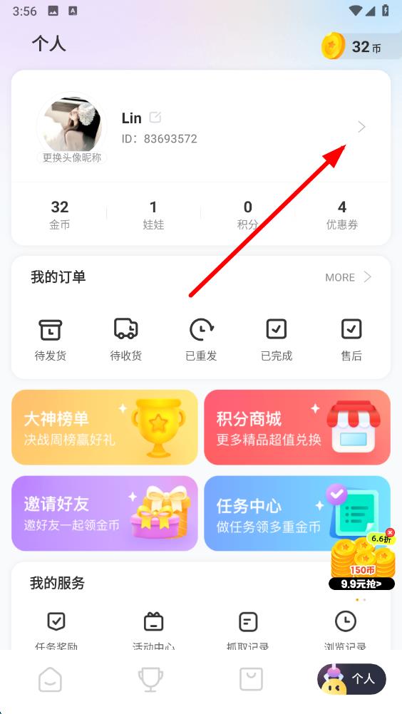 2、在個(gè)人界面中,點(diǎn)擊頭像右側(cè)的箭頭,進(jìn)入個(gè)人資料頁(yè)面。