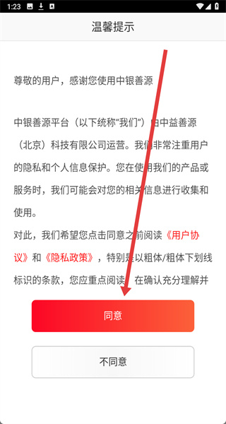 1、點(diǎn)擊“溫馨提示”彈窗的“同意”,進(jìn)入中銀善源主界面。