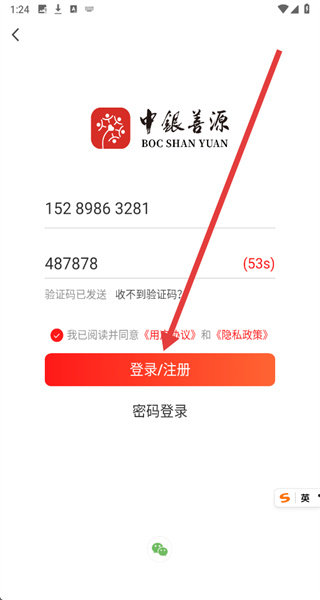 4、輸入收到的短信驗(yàn)證碼,勾選協(xié)議后點(diǎn)擊“登錄/注冊(cè)”按鈕,完成賬號(hào)注冊(cè)登錄。